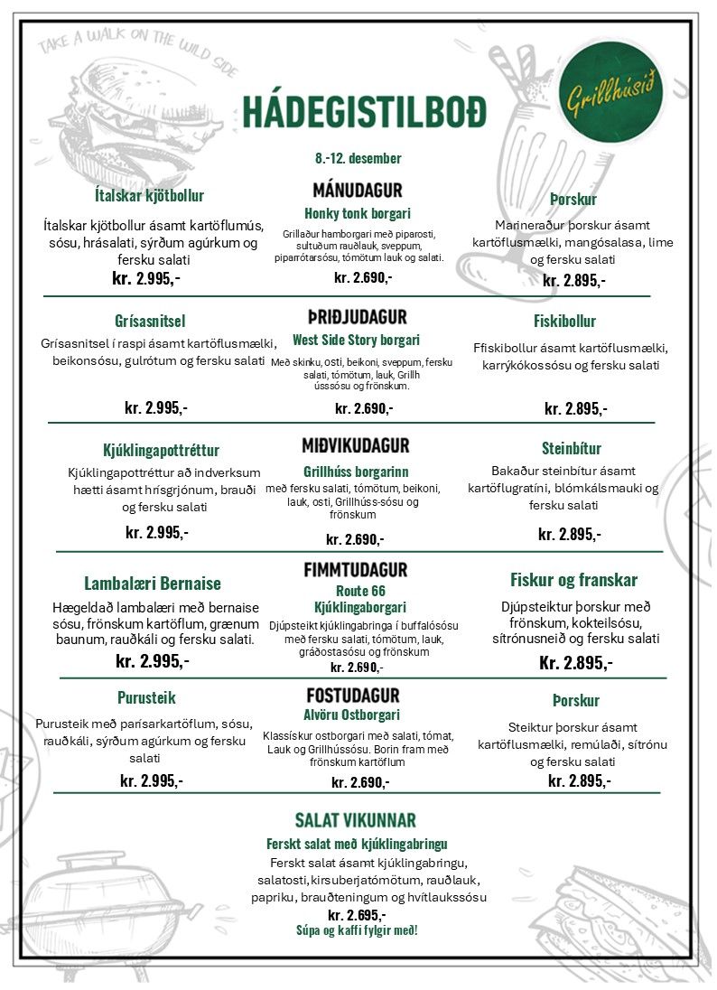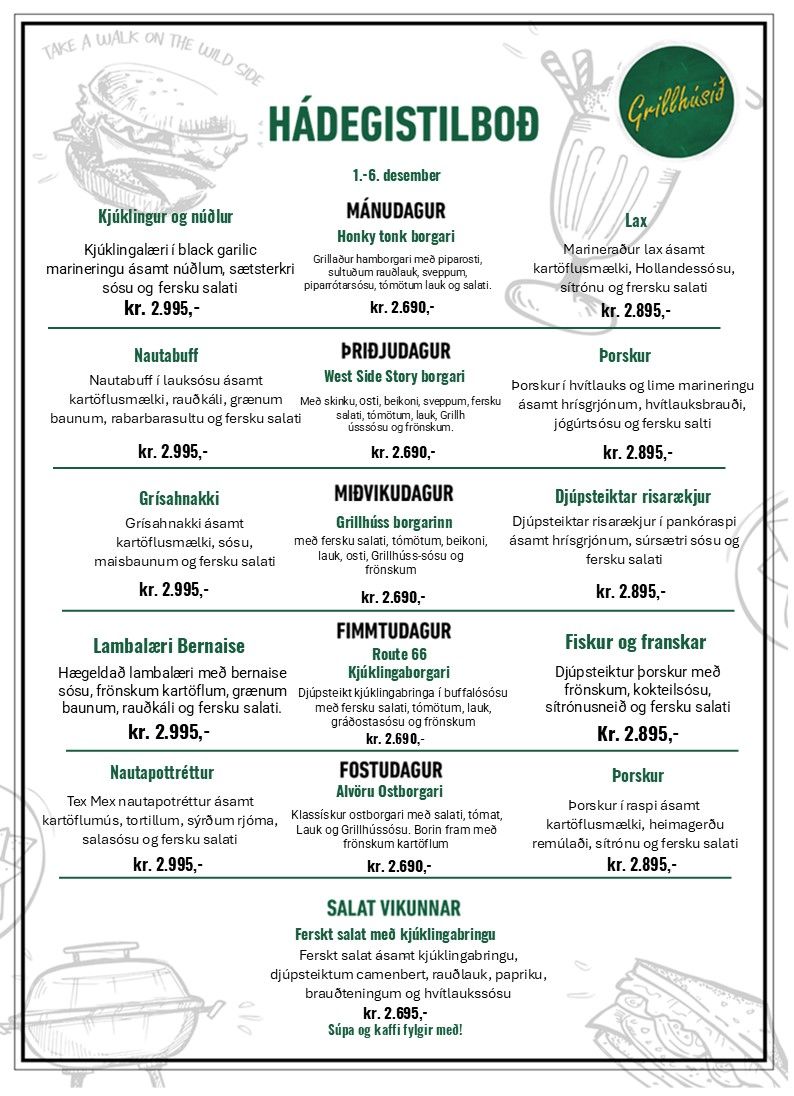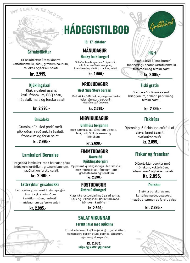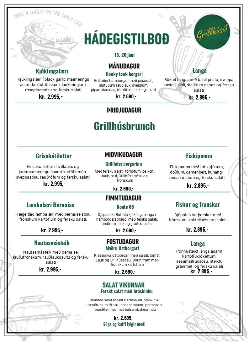 Matseðillinn okkar er fjölbreyttur og allir ættu að geta fundið eitthvað við sitt hæfi, hvort sem maginn er sólginn í létta og ferska rétti, gómsæta hamborgara eða safaríka steik.